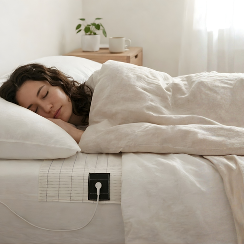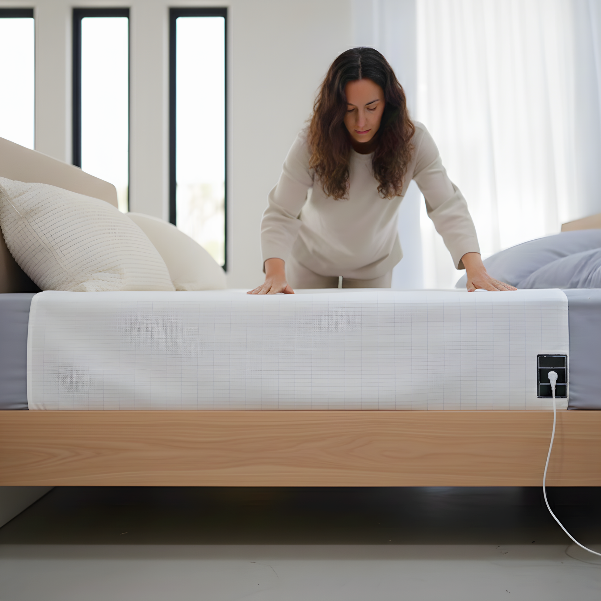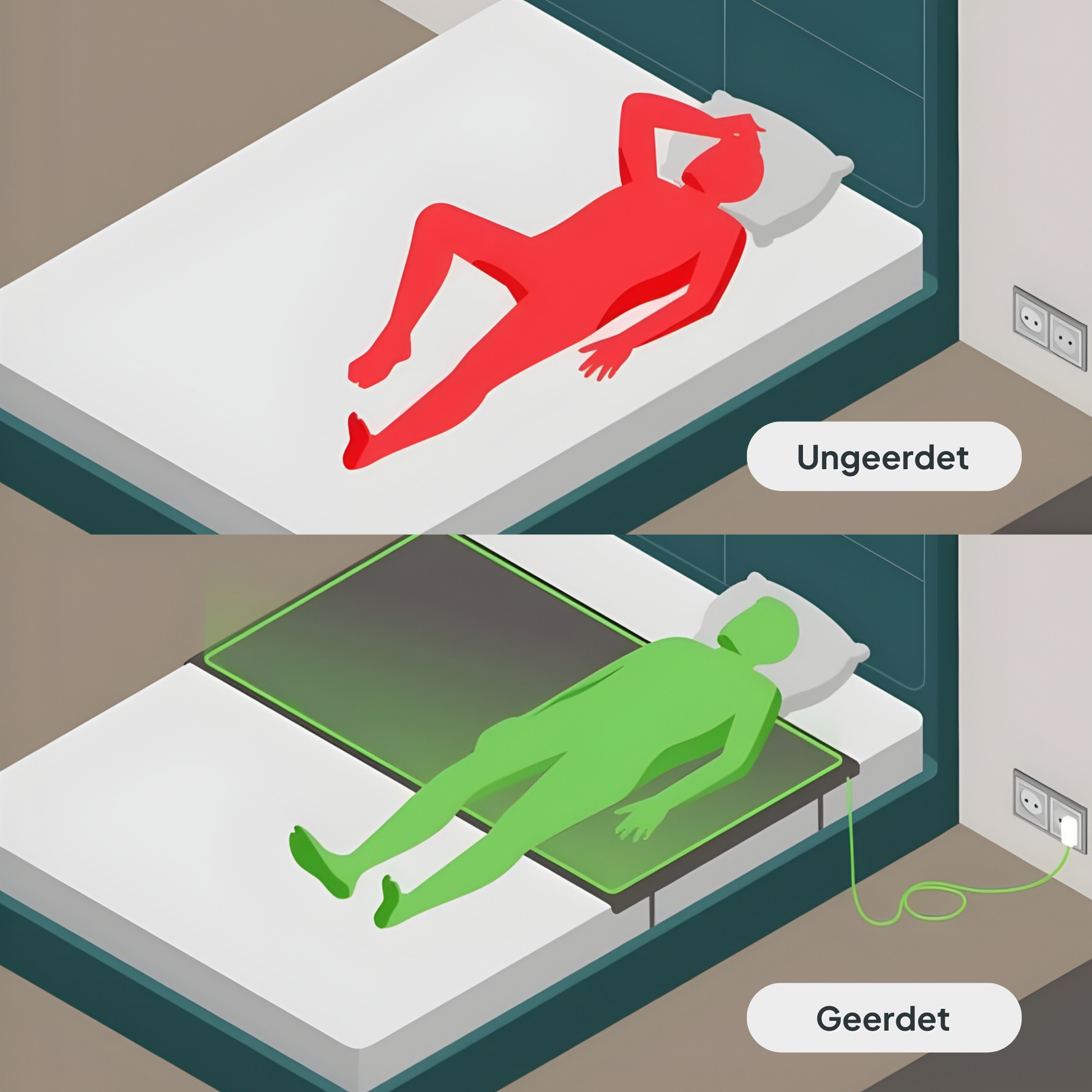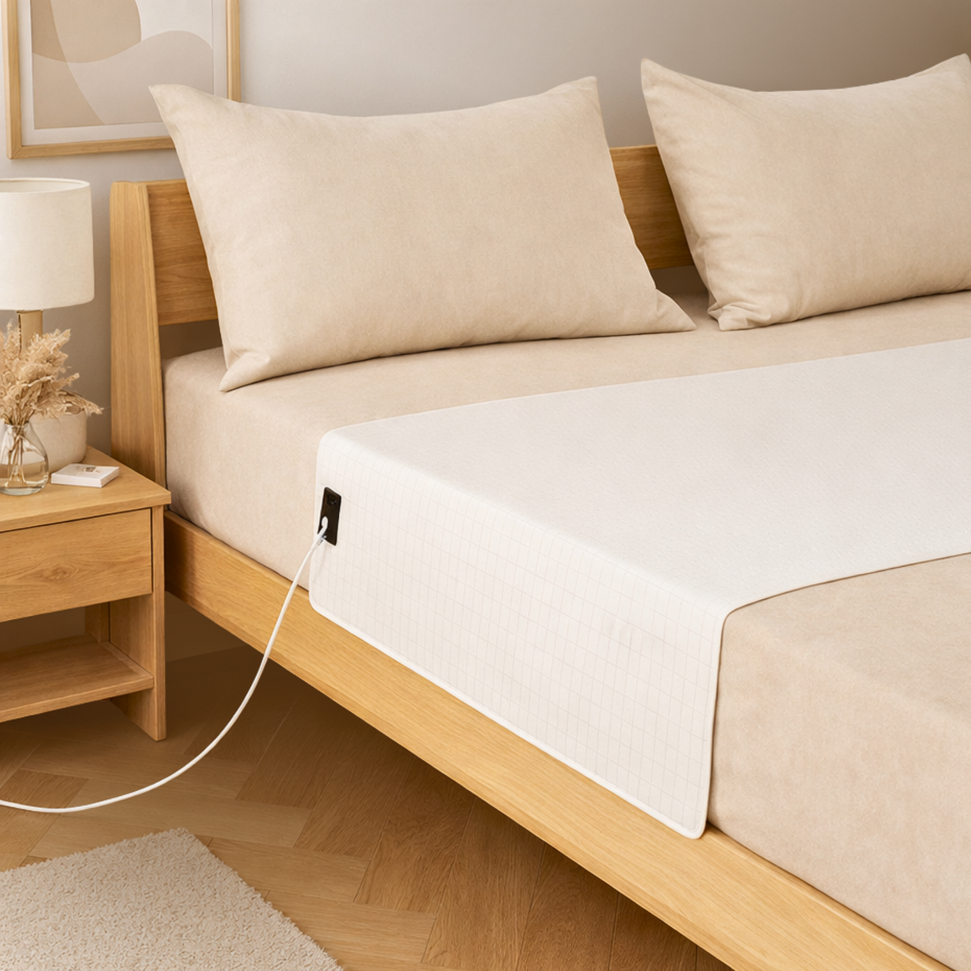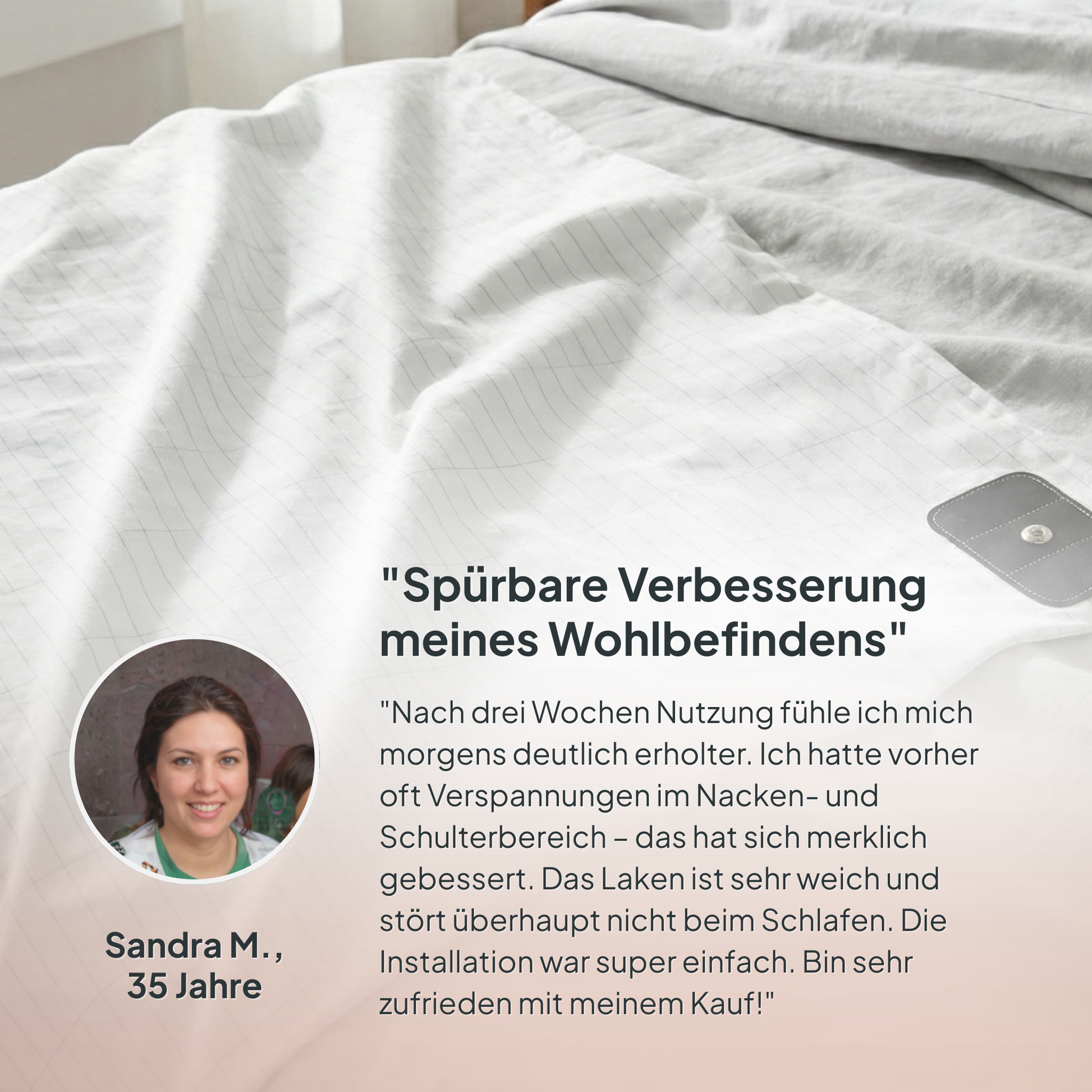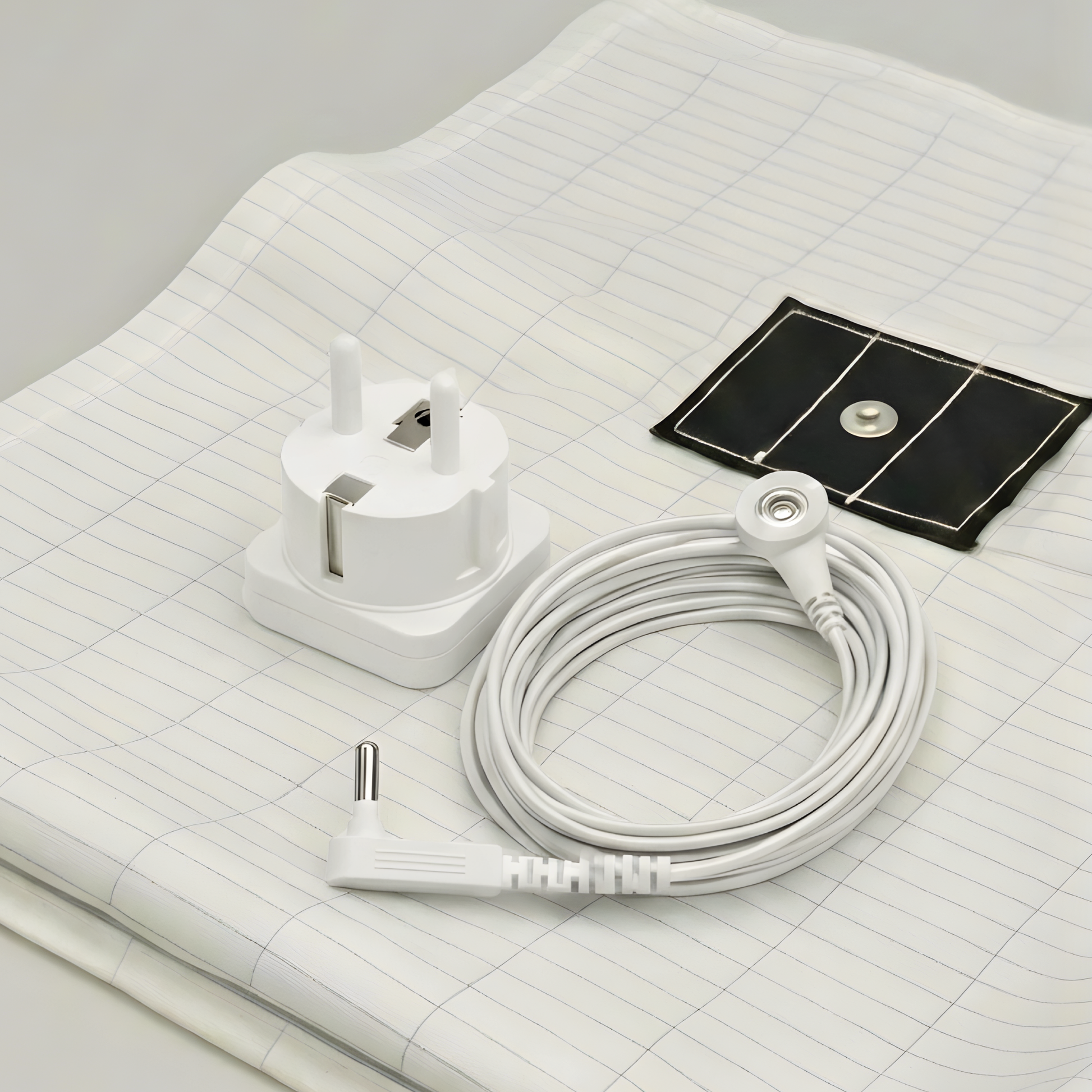 Ein hochwertiges Bettlaken mit leitfähigen Silberfäden, das über ein Erdungskabel mit einer geerdeten Steckdose verbunden wird. Es ermöglicht Hautkontakt mit leitfähigen Materialien – ähnlich wie Barfußgehen auf natürlichem Boden.